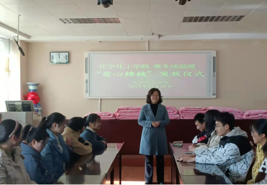 “一床被子,一份温暖,一颗爱心,一份感动”。11月26日,8455新葡萄场网站爱心棉被发放仪式在化学楼407会议室举行。新葡萄官网党委副书记曲剧,辅导员冷向宇、赵方方、严赫老师出席本次发放仪式。